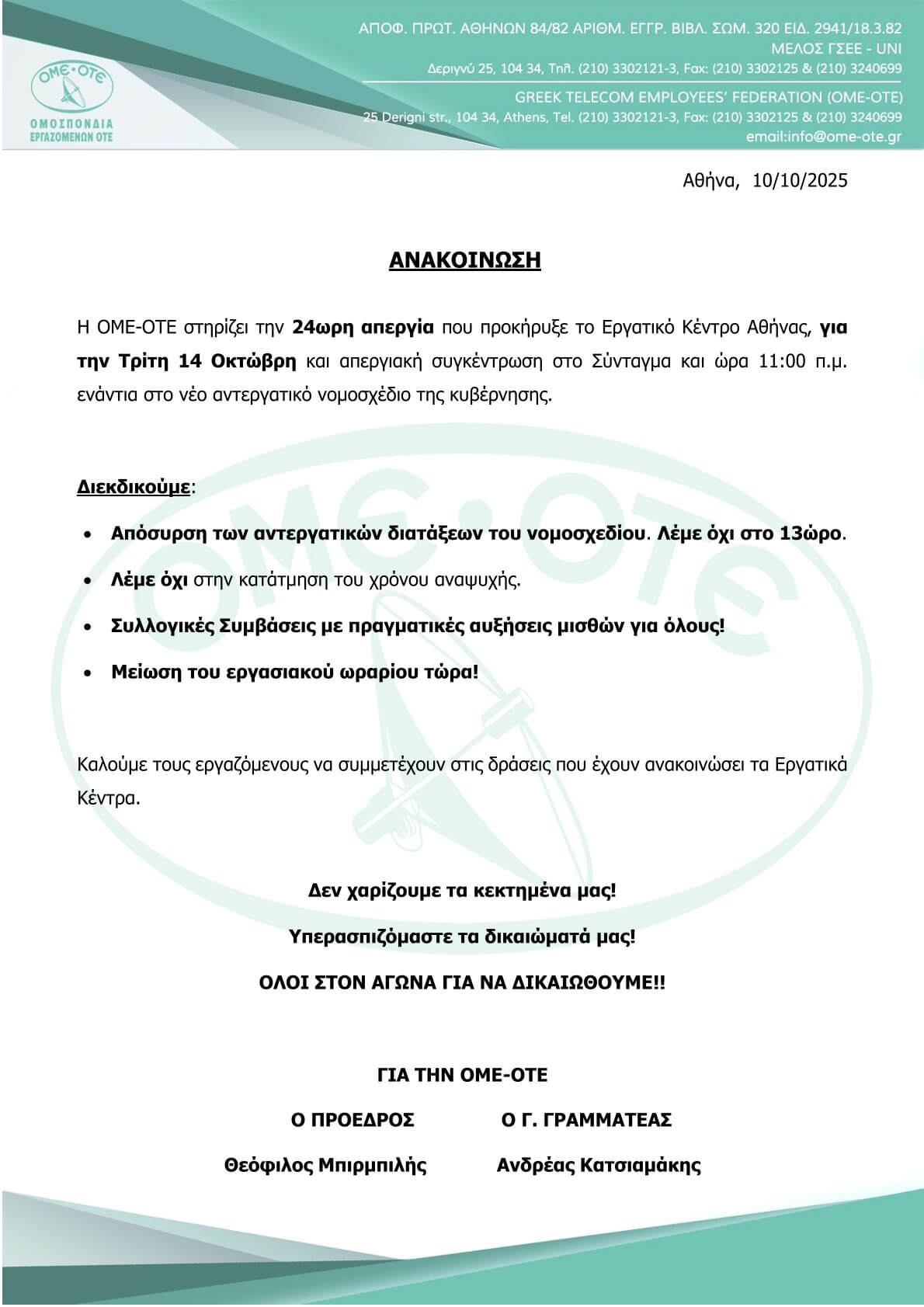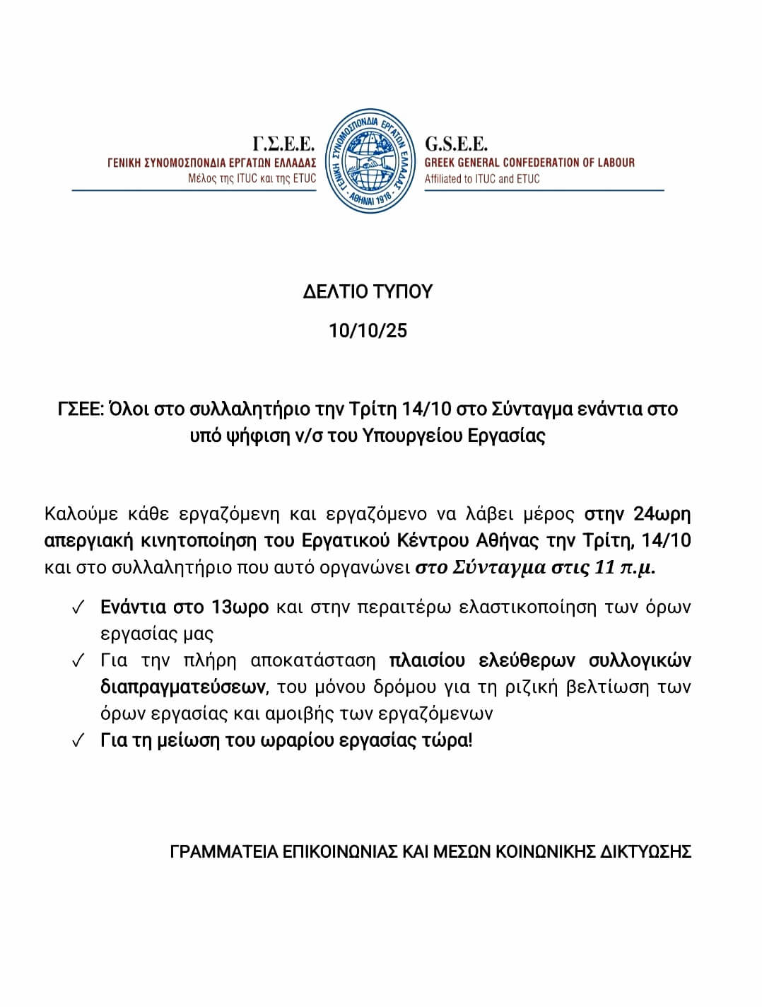 ΥΓ. η ΓΣΕΕ δεν απεργεί (ούτε η ΟΜΕ-ΟΤΕ) αλλά καλεί τους εργαζόμενους στην απεργία των κατα τόπους εργατικών κέντρων…
